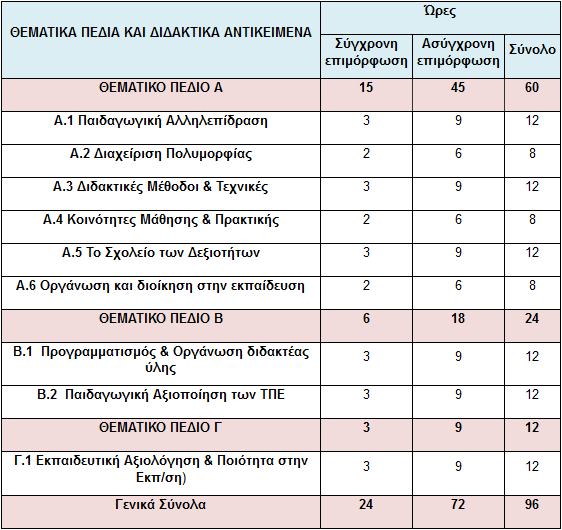 Στη Β΄ φάση θα λειτουργήσουν 604 τμήματα επιμορφούμενων εφαρμόζοντας τεχνικές εξ αποστάσεως εκπαίδευσης (24 ώρες σύγχρονης και 72 ώρες ασύγχρονης) στα ακόλουθα θεματικά πεδία και διδακτικά αντικείμενα: